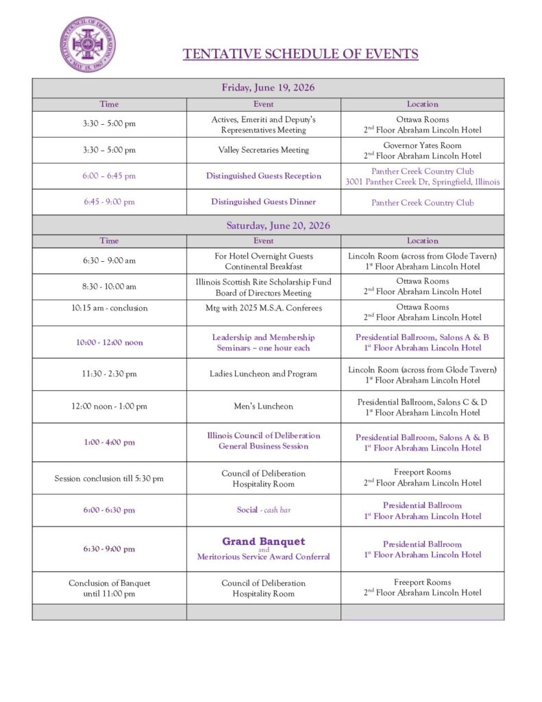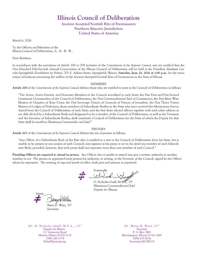 The registration links are open for the 2026 Council of Deliberation.  Any active member of the Scottish Rite is permitted to attend, but only designated members are entitled to vote during the session.